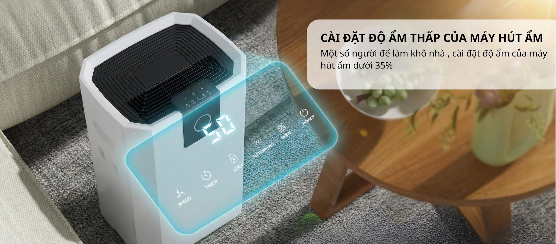 Một số người để làm khô nhà, cài đặt độ ẩm của máy hút ẩm dưới 35%. Trên thực tế, điều này là sai. Trước hết, cơ thể con người cảm thấy độ ẩm không khí tốt nhất là ở mức 55% RH, dao động 5%. Khi ở mức 35% RH, thời gian này quá khô và cảm giác không tốt, dễ xảy ra ngứa da và các vấn đề về hô hấp. Và cài đặt độ ẩm quá thấp sẽ khiến máy hút ẩm hoạt động trong thời gian dài, chưa kể đến việc tiêu thụ nhiều điện năng, mà còn ảnh hưởng đến tuổi thọ của máy hút ẩm. Vì vậy, độ ẩm của máy hút ẩm được cài đặt trong khoảng 55-60% RH là tốt hơn. Độ ẩm này sẽ không khiến mọi thứ trong nhà bị ẩm ướt và nấm mốc.