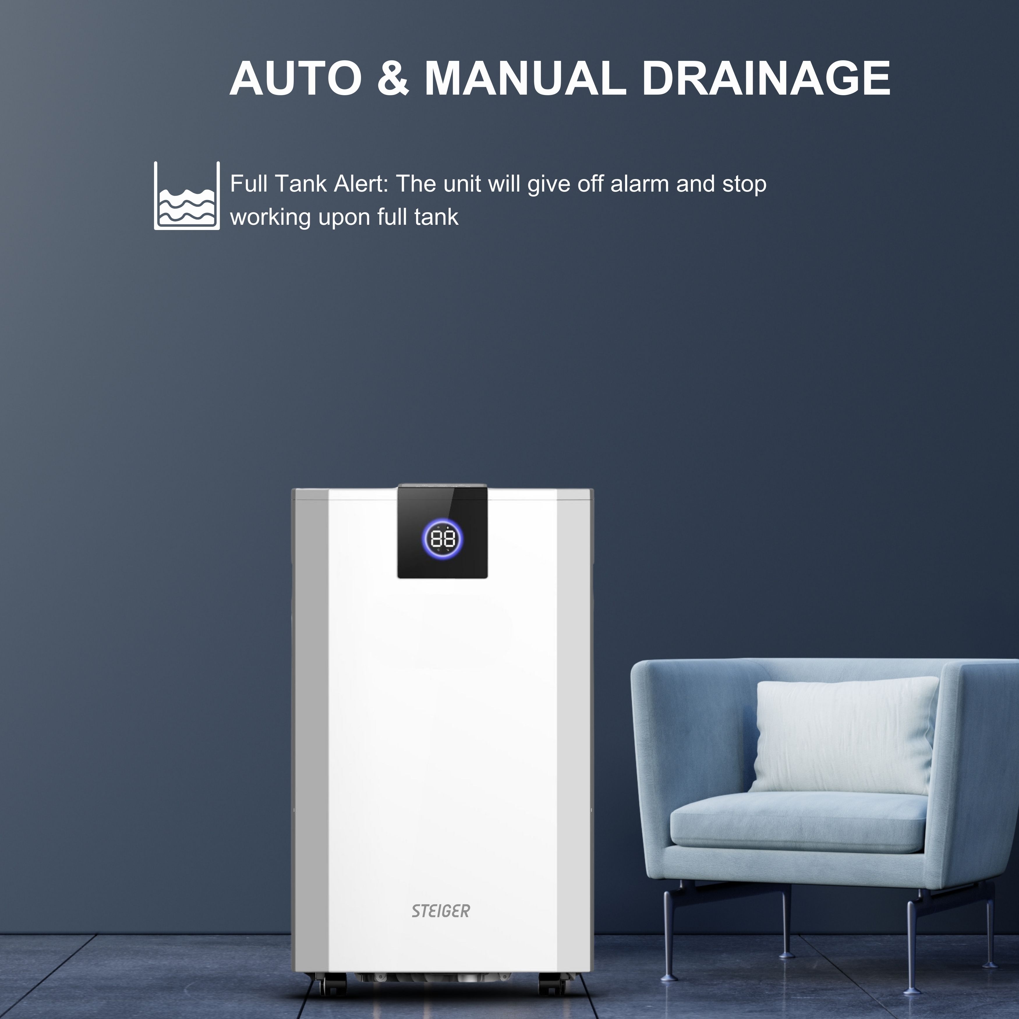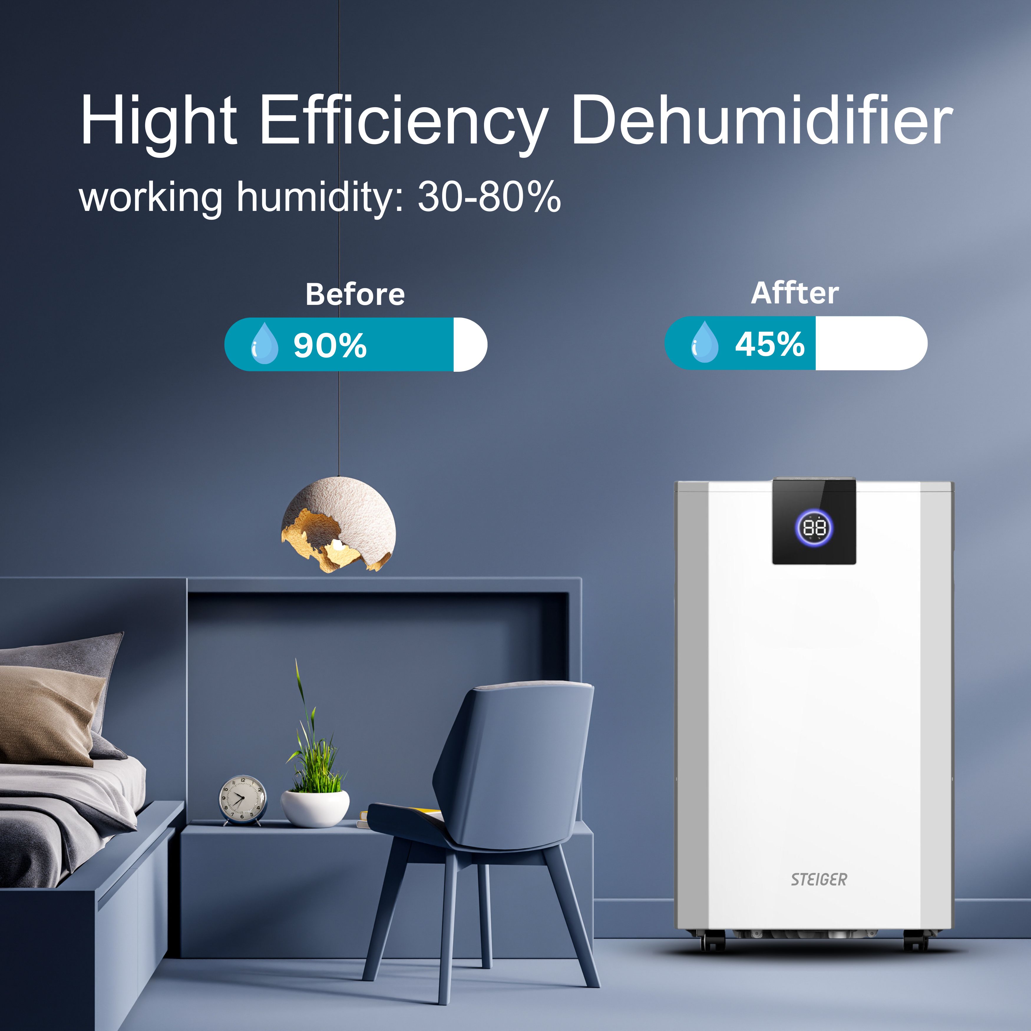 Máy hút ẩm Steiger STG - 855BW 55L sở hữu lực hút cực kỳ lớn. Trong điều kiện nhiệt độ môi trường là 30℃, độ ẩm RH80%, máy có khả năng hút được 55L nước từ trong không khí trong 1 ngày. Mang lại không khí khô thoáng trong những ngày ẩm ướt nhất, bảo quản quần áo và đồ dùng trong nhà khỏi nguy cơ bị ẩm mốc.