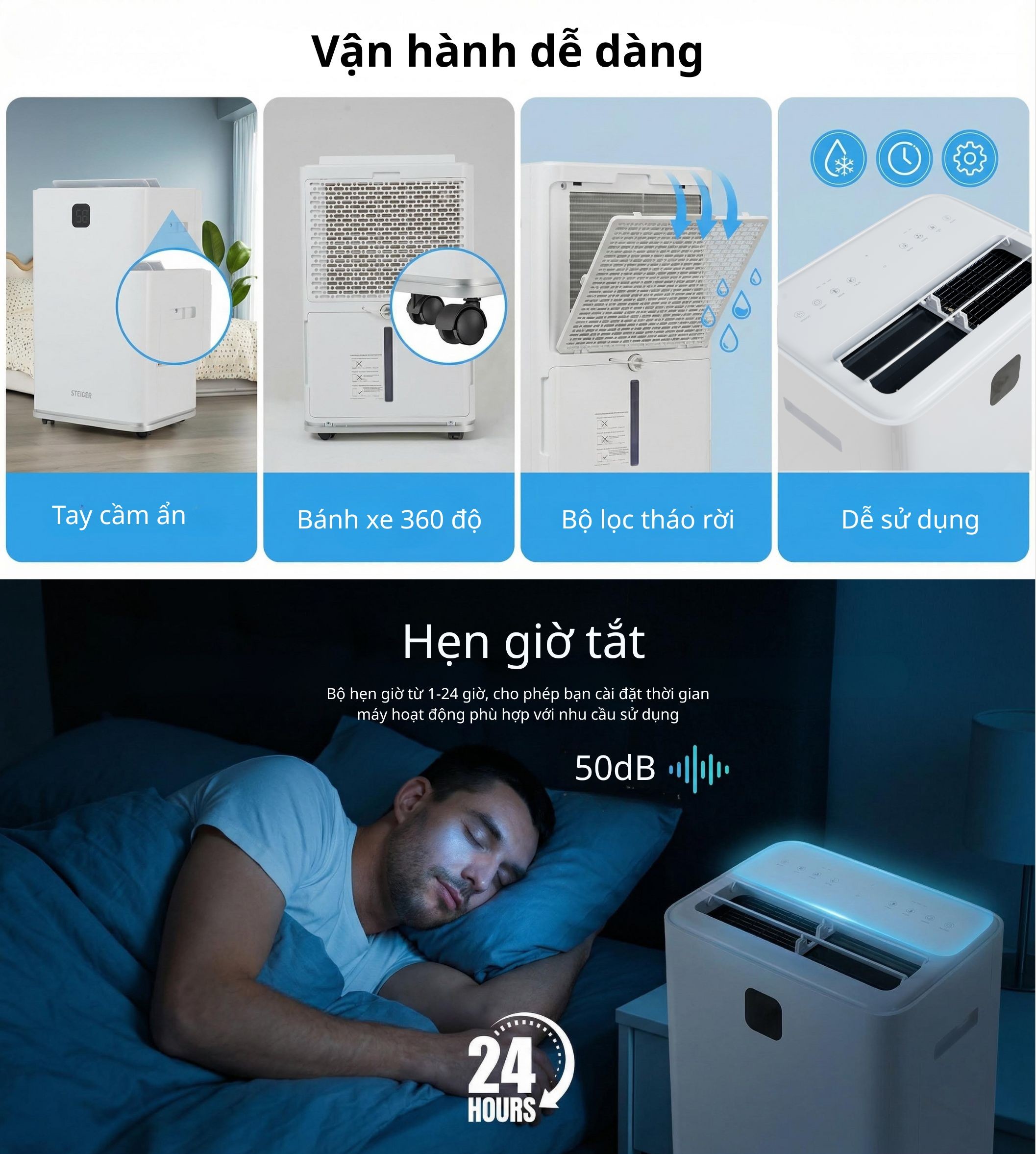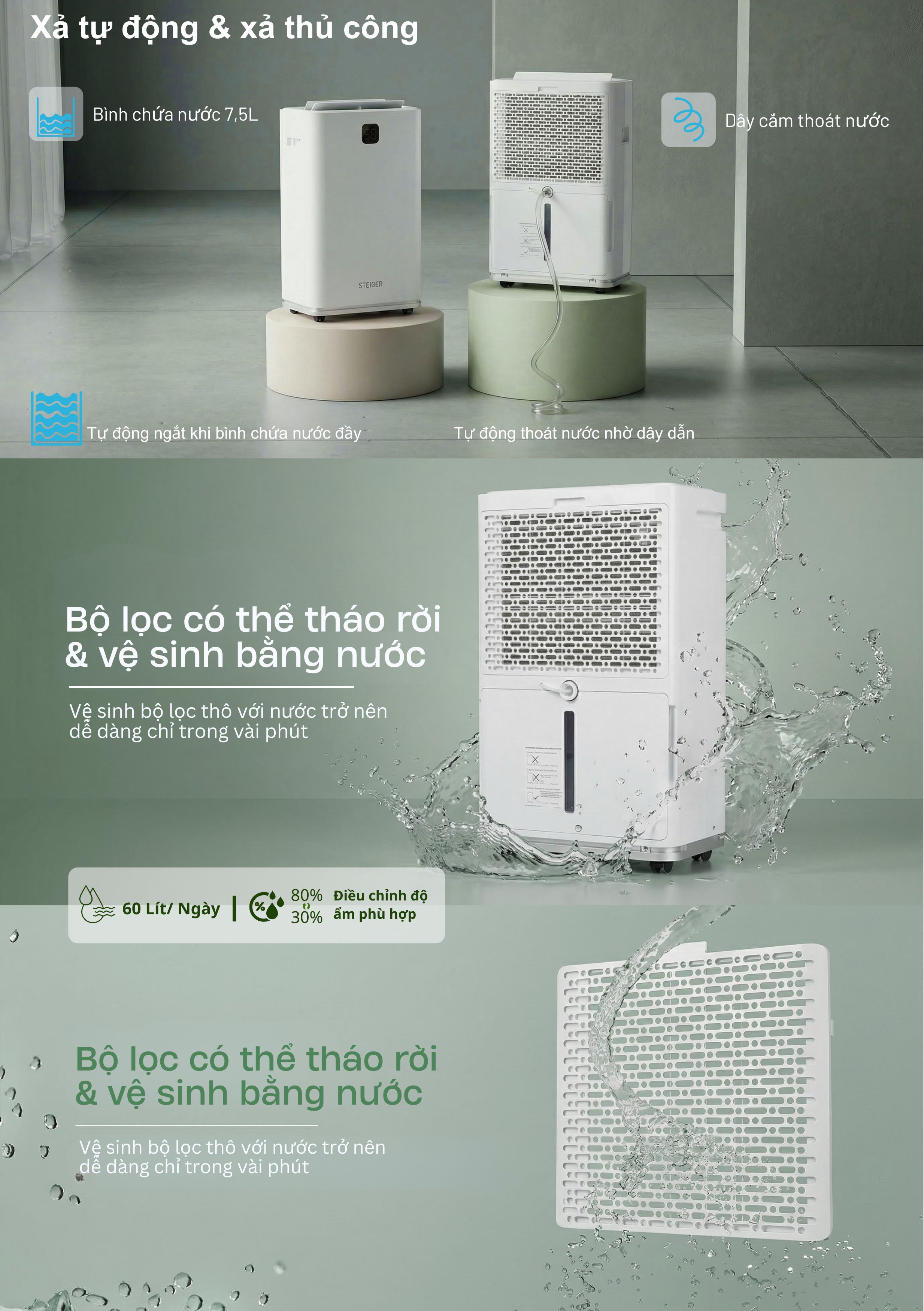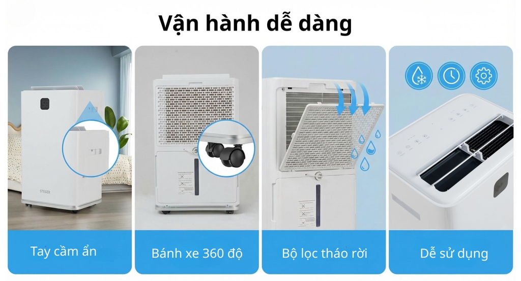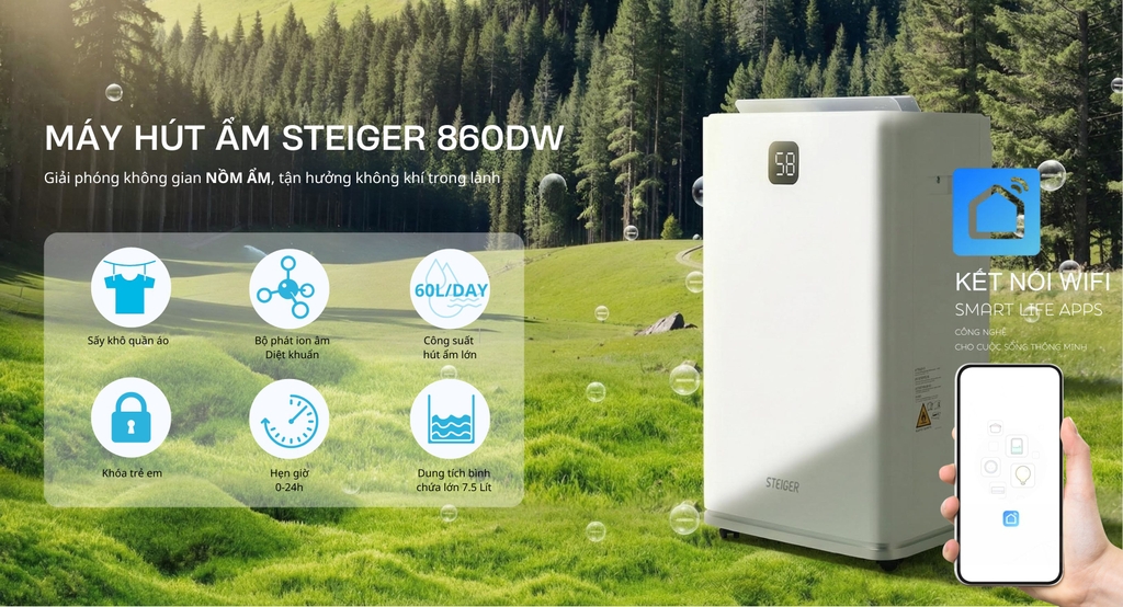 Máy hút ẩm STEIGER STG-860DW có công suất hút ẩm lên tới 60L/ngày (ở điều kiện nhiệt độ 30°C và độ ẩm 80% RH). Công suất lớn này giúp giảm độ ẩm nhanh chóng và hiệu quả, đặc biệt phù hợp với các không gian rộng lớn như phòng khách, phòng ngủ, hay tầng hầm.