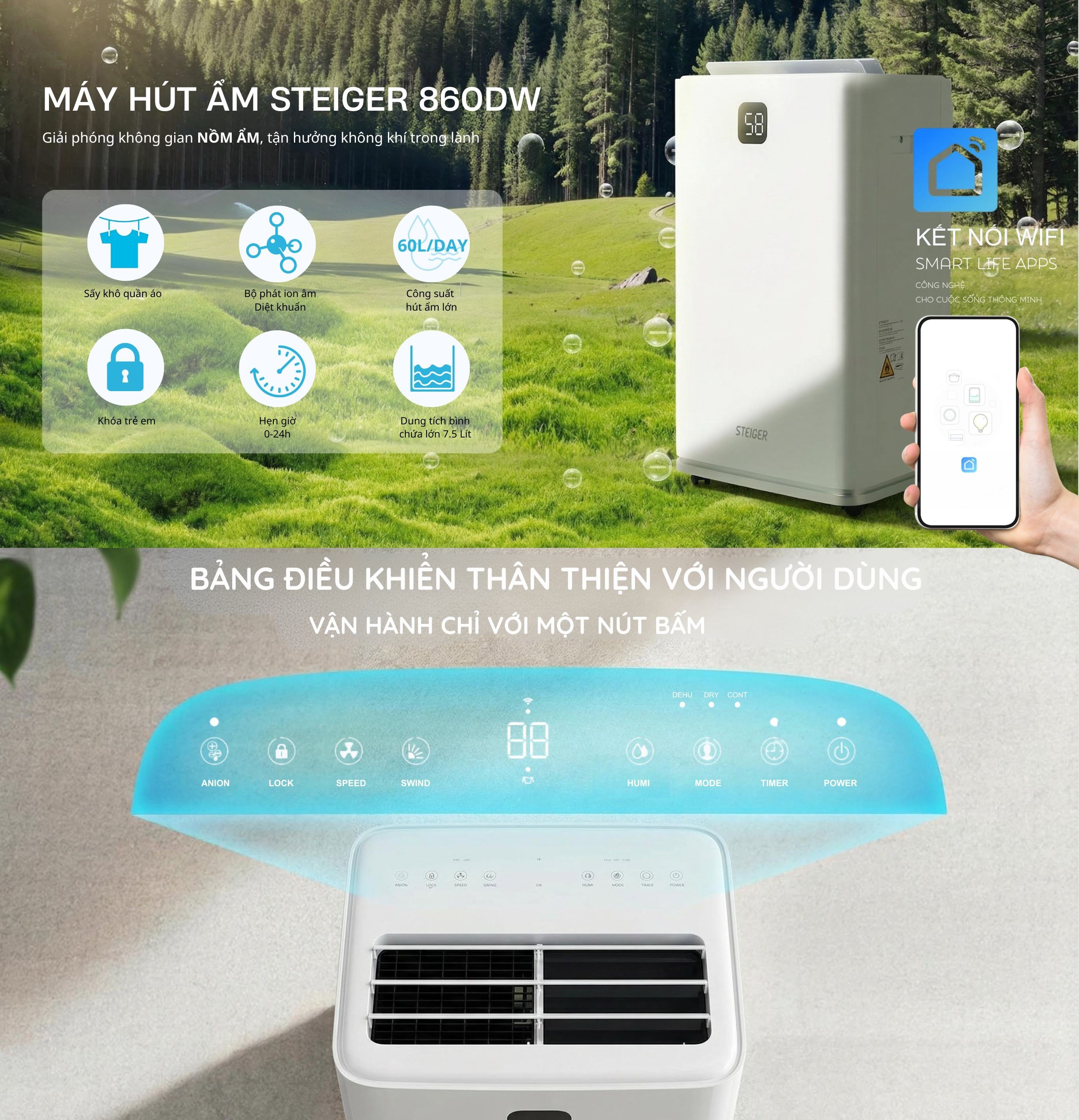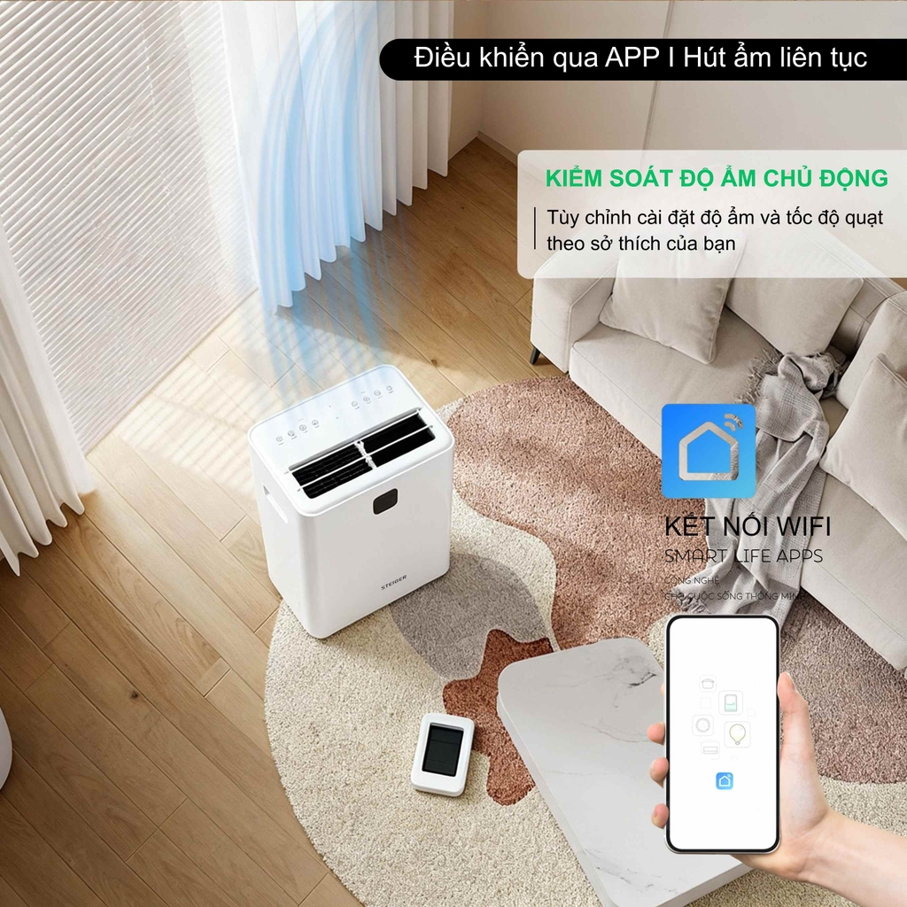 Máy hút ẩm này được tích hợp WiFi, cho phép theo dõi và điều khiển từ xa qua ứng dụng trên điện thoại.có thể dễ dàng bật, tắt hoặc điều chỉnh cài đặt máy từ bất kỳ đâu, giúp tiết kiệm thời gian và mang lại sự tiện lợi tối đa khi sử dụng.